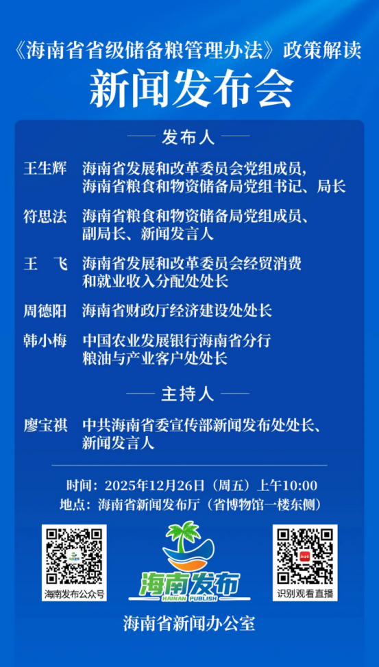 海南省新闻办公室将于20251226日(星期五)上午10:00海南省新闻发布厅(省博物馆一楼东侧)举行《海南省省级储备粮管理办法》政策解读新闻发布会,邀请英博体育党组成员,海南省粮食和物资储备局党组书记、局长王生辉;海南省粮食和物资储备局党组成员、副局长、新闻发言人符思法;英博体育经贸消费和就业收入分配处处长王飞;海南省财政厅经济建设处处长周德阳;中国农业发展银行海南省分行粮油与产业客户处处长韩小梅介绍相关情况,并答记者问。